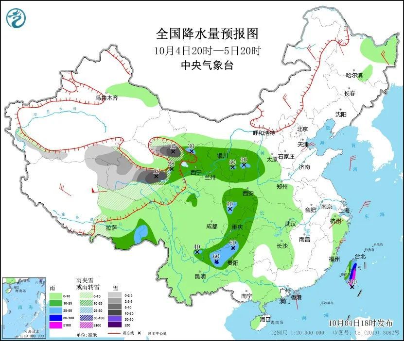 1、10月4日20时至5日20时,青海中西部、西藏东部、甘肃西部等地有小到中雪或雨夹雪,青海中部局地有大到暴雪,西藏东南部、陕西、四川盆地东北部、贵州西部、台湾岛等地部分地区有大到暴雨,其中,台湾岛东部和南部等地部分地区有大暴雨,台湾岛南部等地局地特大暴雨。