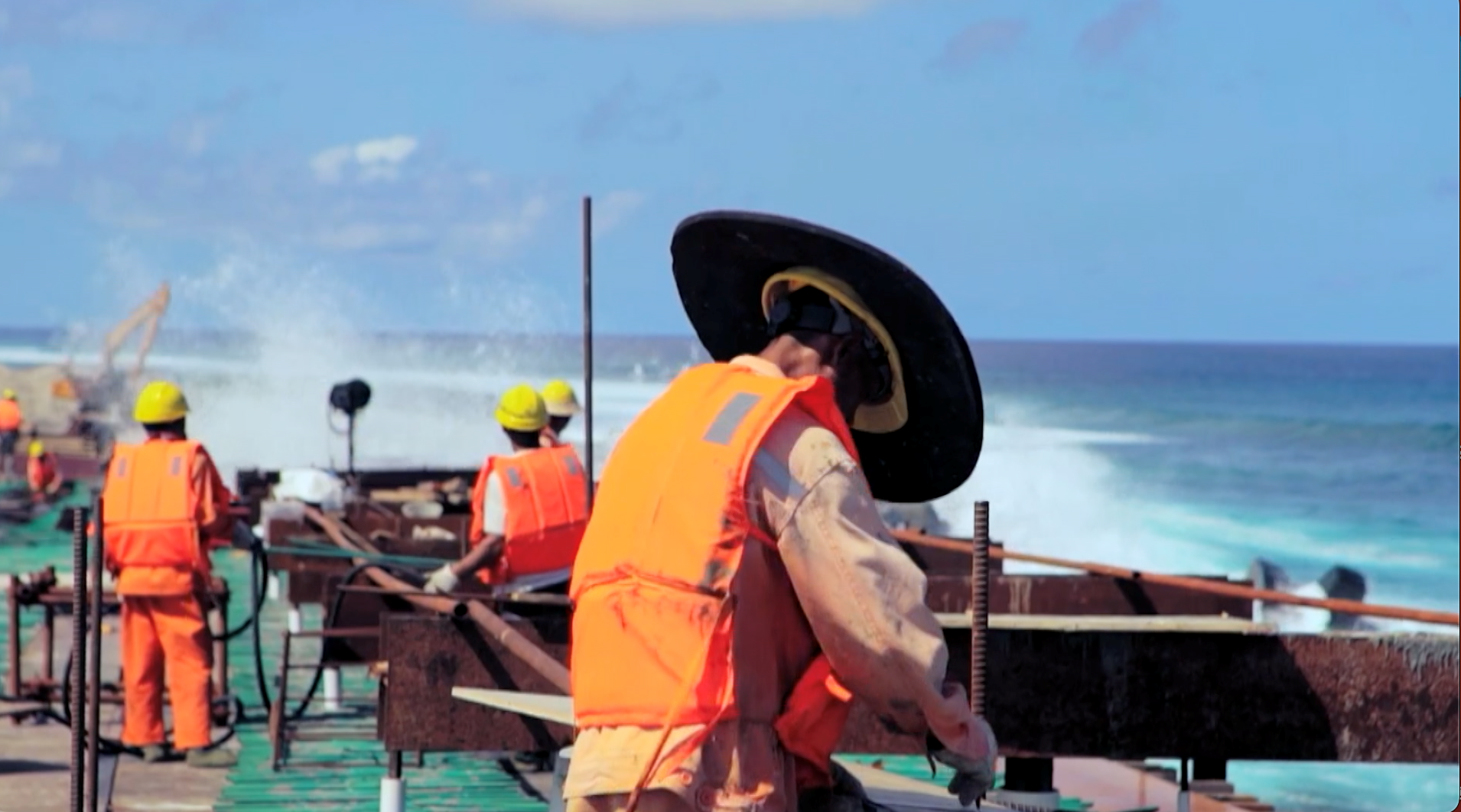 而此时,在两公里外的嘎杜海峡上,中国建设者正与惊涛骇浪斗、 与高温高湿斗、与复杂地质斗……