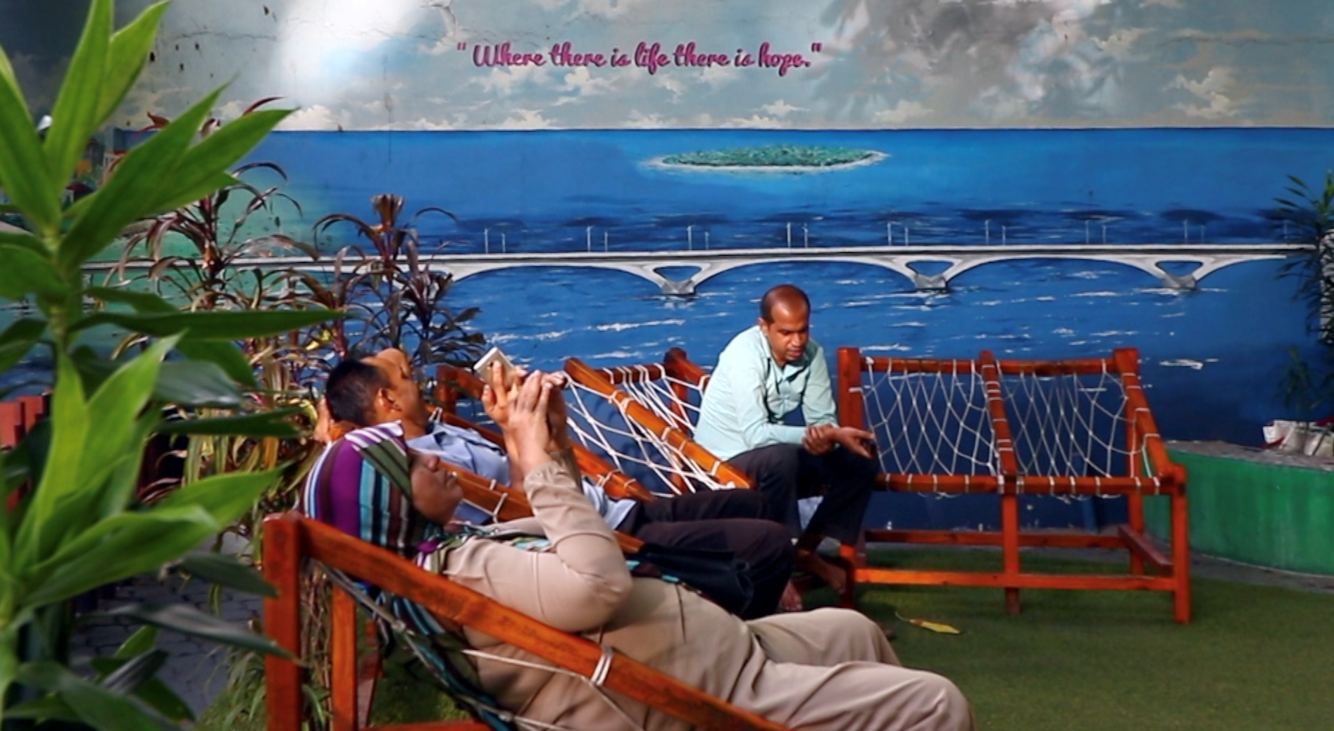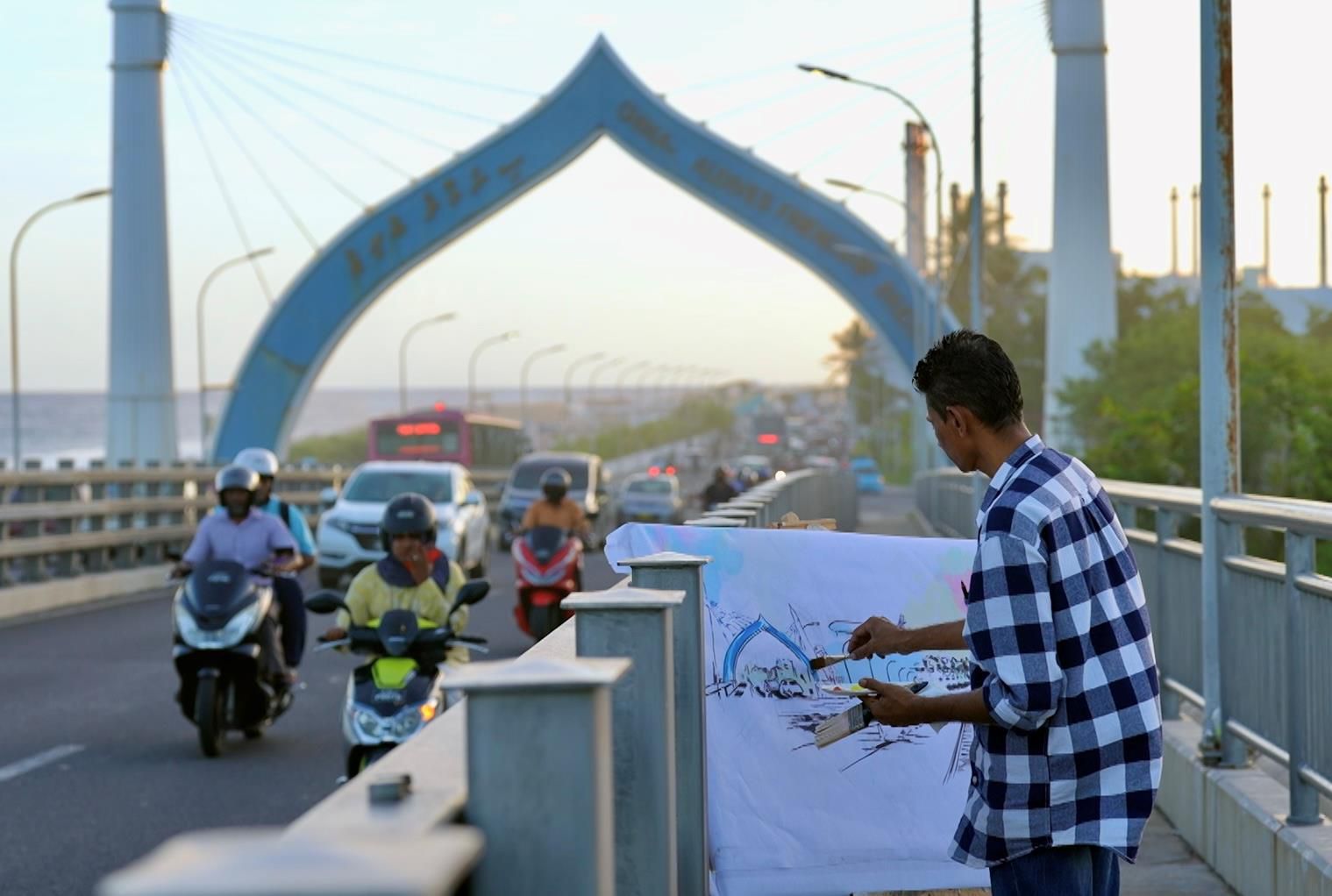 马尔代夫首都马累,市中心最热闹的花园里,阳光在墙面洒下斑驳树影,一座大桥跨海而立。这是画家阿米尔在2016年创作的一幅大型壁画。