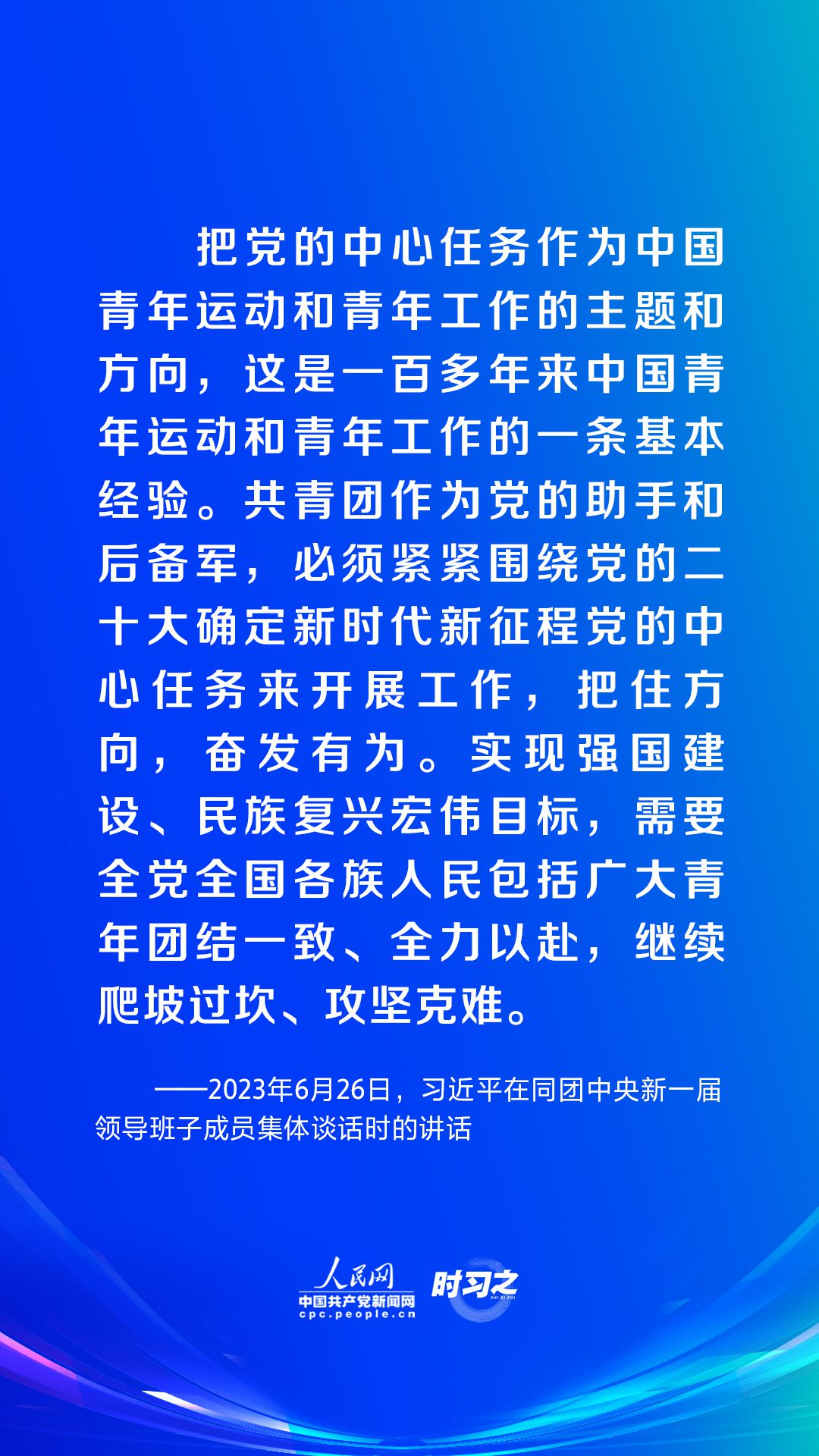 “把党的中心任务作为中国青年运动和青年工作的主题和方向,这是一百多年来中国青年运动和青年工作的一条基本经验。”长期以来,习近平总书记立足于“确保党的事业薪火相传,确保中华民族永续发展”的深远考虑,将青年工作放在党和国家发展的战略高度去考量,激励广大青年担当起党和人民赋予的历史重任。