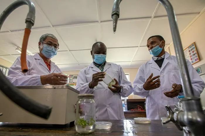 △2021年6月25日,肯尼亚,来自中国的农学教授与肯尼亚农业专家、肯方研究生在实验室内交流实验成果。