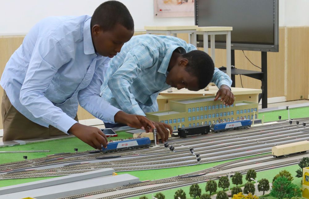 在位于吉布提首都吉布提市的吉布提工商学校,学生在鲁班工坊铁道运营沙盘教学区学习(2022年9月19日摄)。新华社记者 董江辉 摄