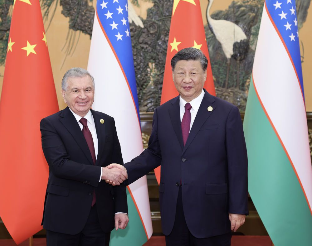 10月17日下午,国家主席习近平在人民大会堂会见来华出席第三届“一带一路”国际合作高峰论坛的乌兹别克斯坦总统米尔济约耶夫。