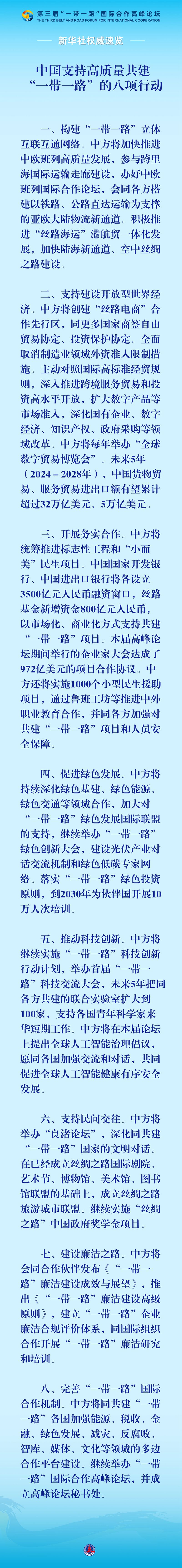 10月18日,国家主席习近平在第三届“一带一路”国际合作高峰论坛开幕式上发表主旨演讲,宣布中国支持高质量共建“一带一路”的八项行动。