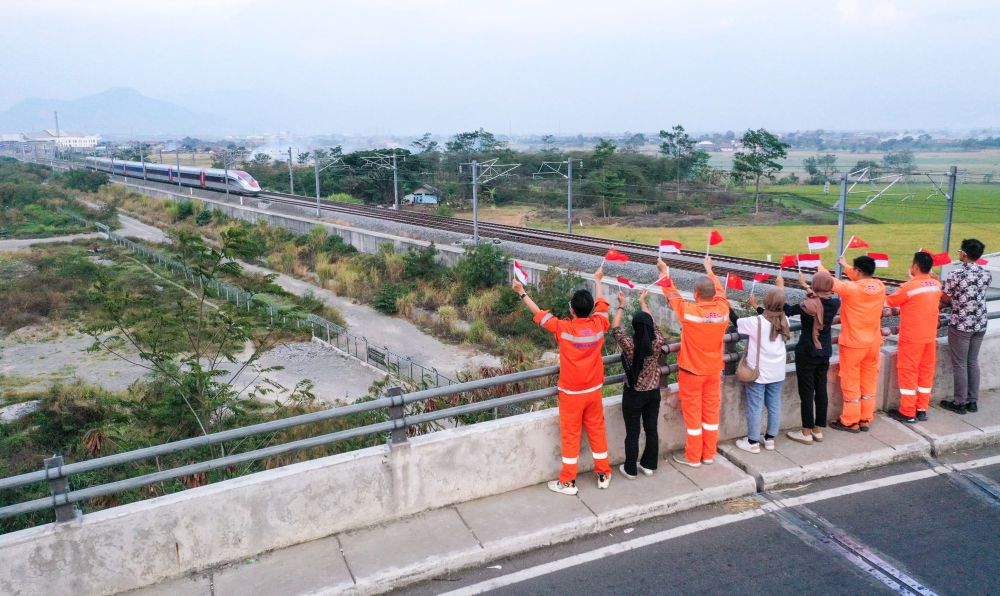 10月17日,在印度尼西亚万隆一座天桥上,雅万高铁建设单位之一中铁电气化局的中国和印尼籍员工挥舞着中国和印尼两国国旗,向远处驶来的一列雅万高铁高速动车组列车欢呼(无人机照片)。新华社记者 徐钦 摄