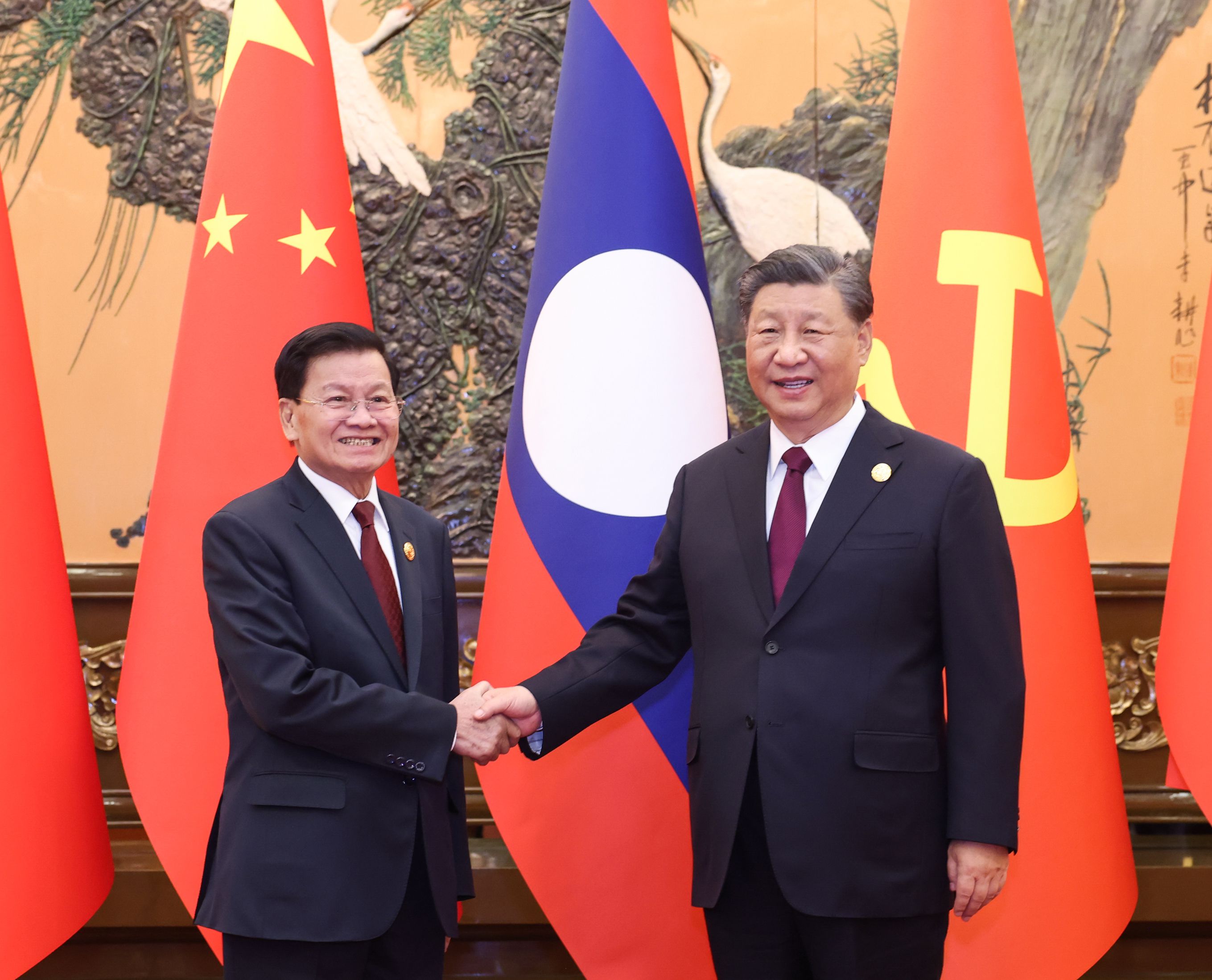 10月20日上午,中共中央总书记、国家主席习近平在人民大会堂会见来华出席第三届“一带一路”国际合作高峰论坛并进行工作访问的老挝人民革命党中央总书记、国家主席通伦。
