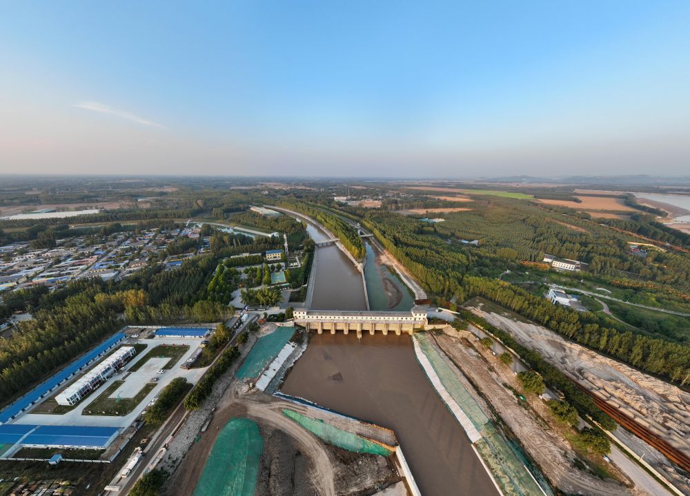 山东聊城位山灌区的黄河位山闸和引水渠(2023年10月10日摄,无人机照片)。新华社记者 邢广利 摄