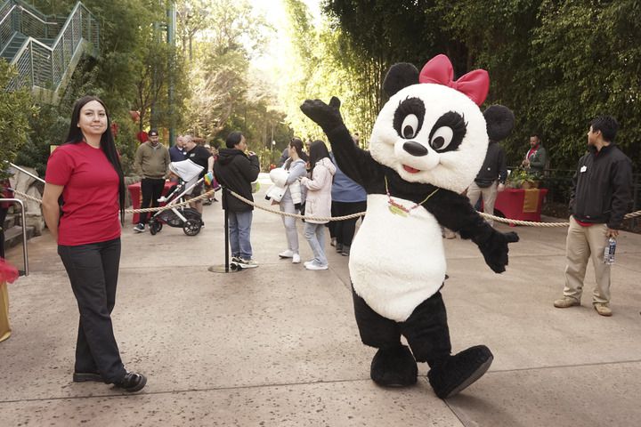 2月4日,在美国圣迭戈动物园,一名装扮成熊猫的工作人员在春节庆祝活动上欢迎游客。