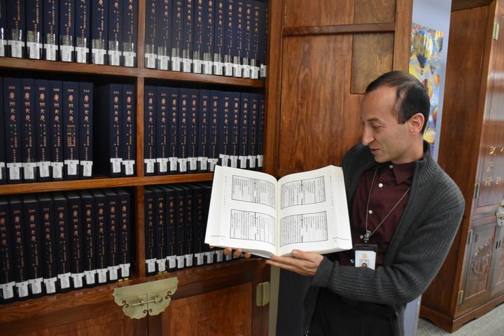 4月20日,一名图书管理员在美国洛杉矶公共图书馆的中央图书馆展示《广州大典》。