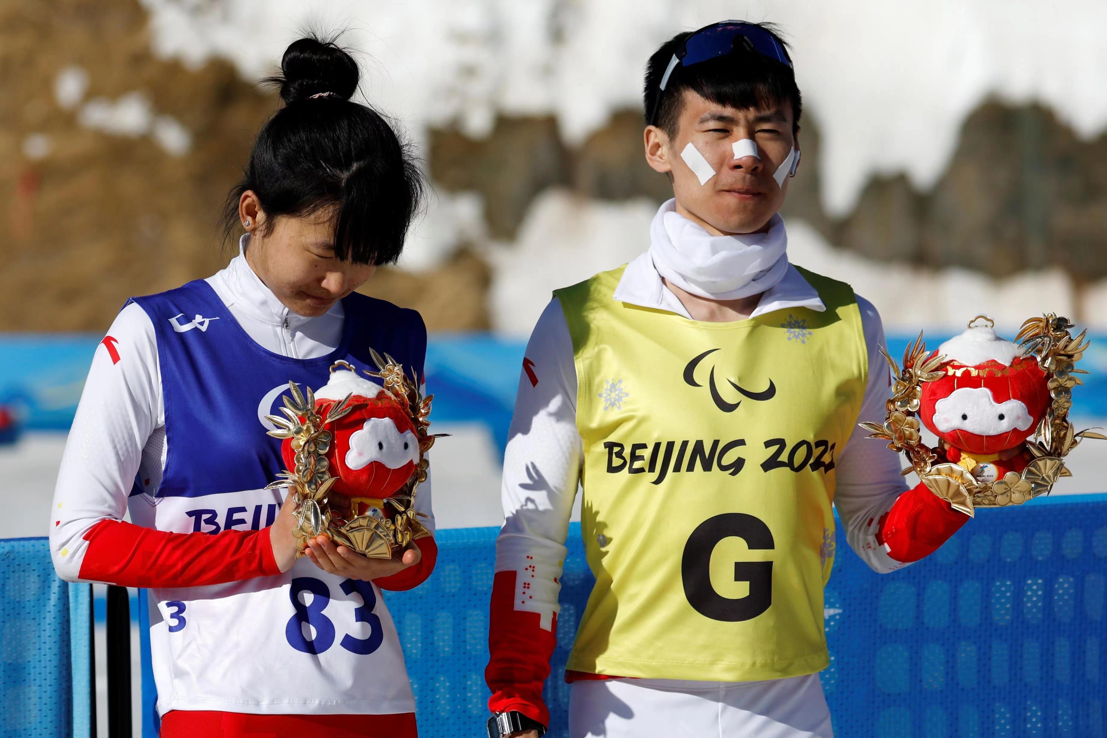 △2022年3月8日,在2022冬残奥会残奥冬季两项女子中距离(视障)比赛中,中国选手王跃(左)获季军。