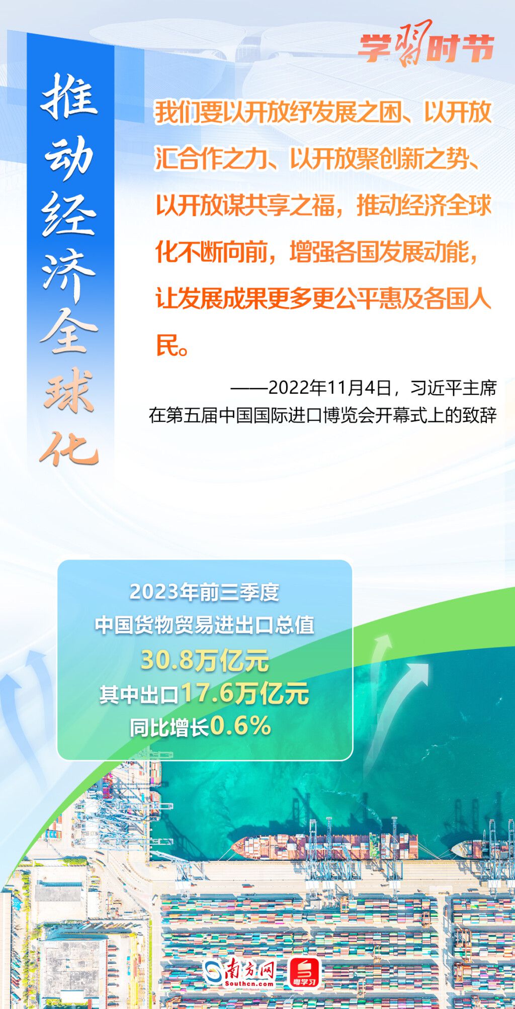 11月5日至10日,第六届中国国际进口博览会将在上海举行。这个由习近平主席亲自谋划、亲自部署、亲自推动的世界上首个以进口为主题的国家级展会,目前已成为举世瞩目的贸易盛会、开放合作的重要平台、全球共享的国际公共产品。第六届进博会举行在即,让我们通过一组海报,重温习近平主席在过去五届进博会上的重要讲话,深刻认识高水平对外开放的时代意义与关键作用。