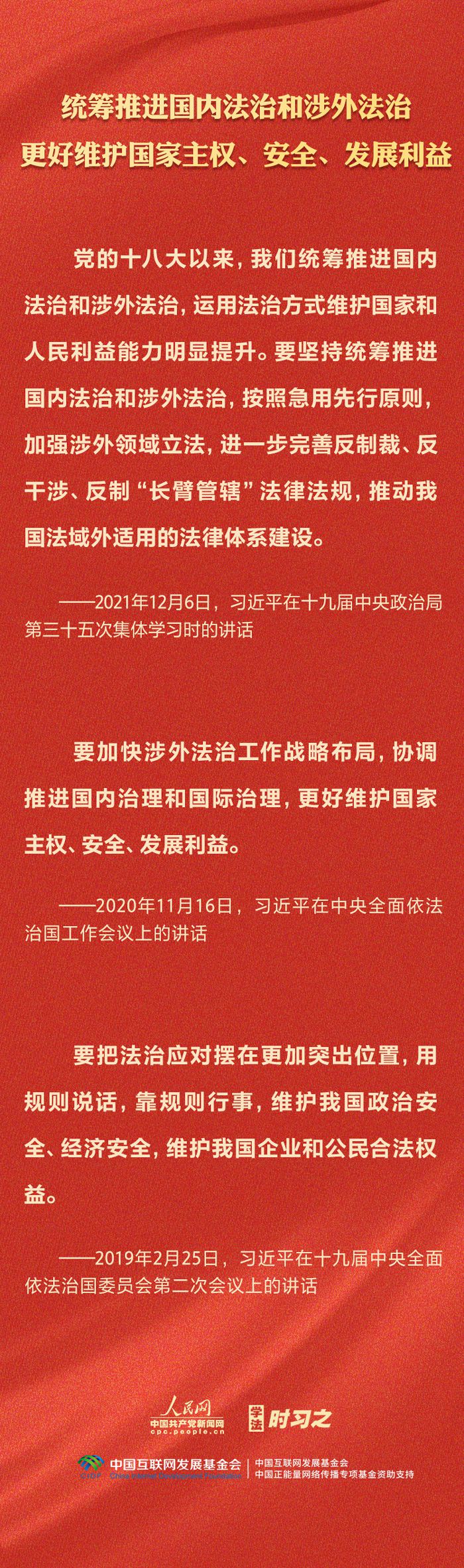 今年是贯彻落实党的二十大精神的开局之年。中共中央政治局决定从今年4月开始,在全党自上而下开展学习贯彻习近平新时代中国特色社会主义思想主题教育。习近平法治思想是习近平新时代中国特色社会主义思想的重要组成部分,人民网·中国共产党新闻网推出学法时习之·学习习近平法治思想系列策划,本篇聚焦“坚持统筹推进国内法治和涉外法治”。