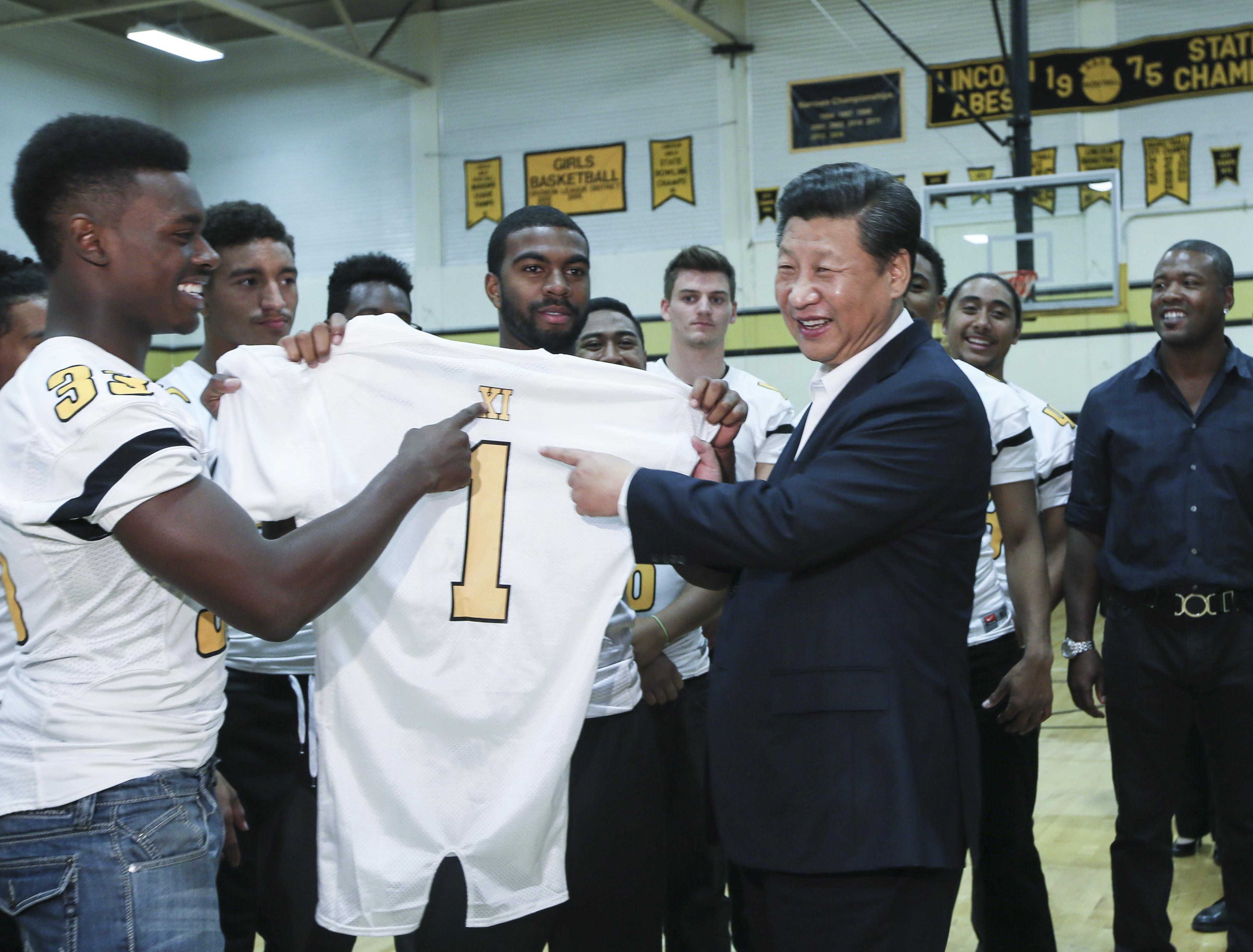 △ 2015年9月23日,国家主席习近平参观美国塔科马市林肯中学。这是习近平接受学生们赠送的橄榄球衣。