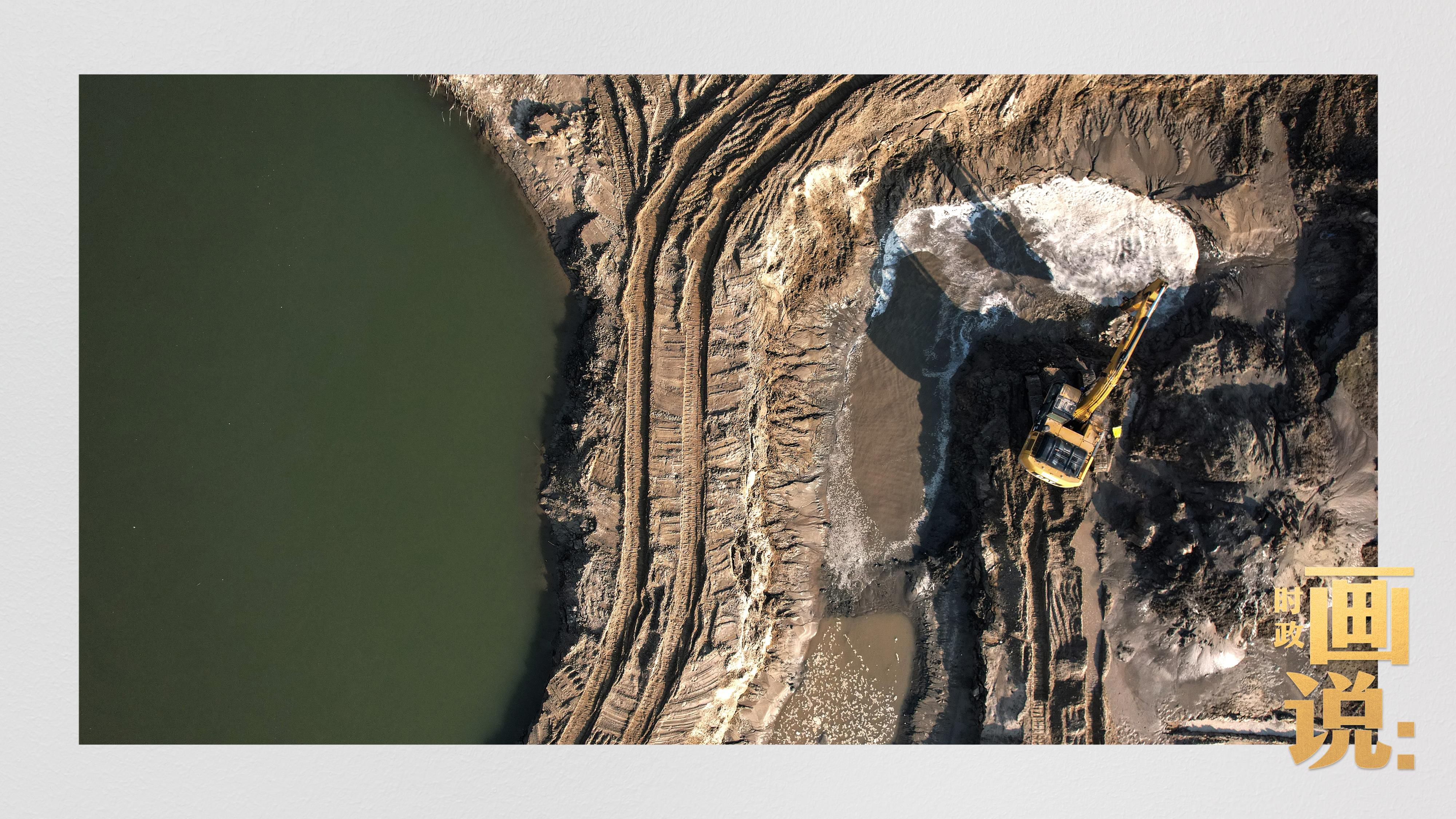 △晨暮中的白沟河河道内,挖掘机正在疏浚作业。涿州,河北。今年7月底8月初,华北、黄淮等地出现极端降雨,引发洪涝和地质灾害。