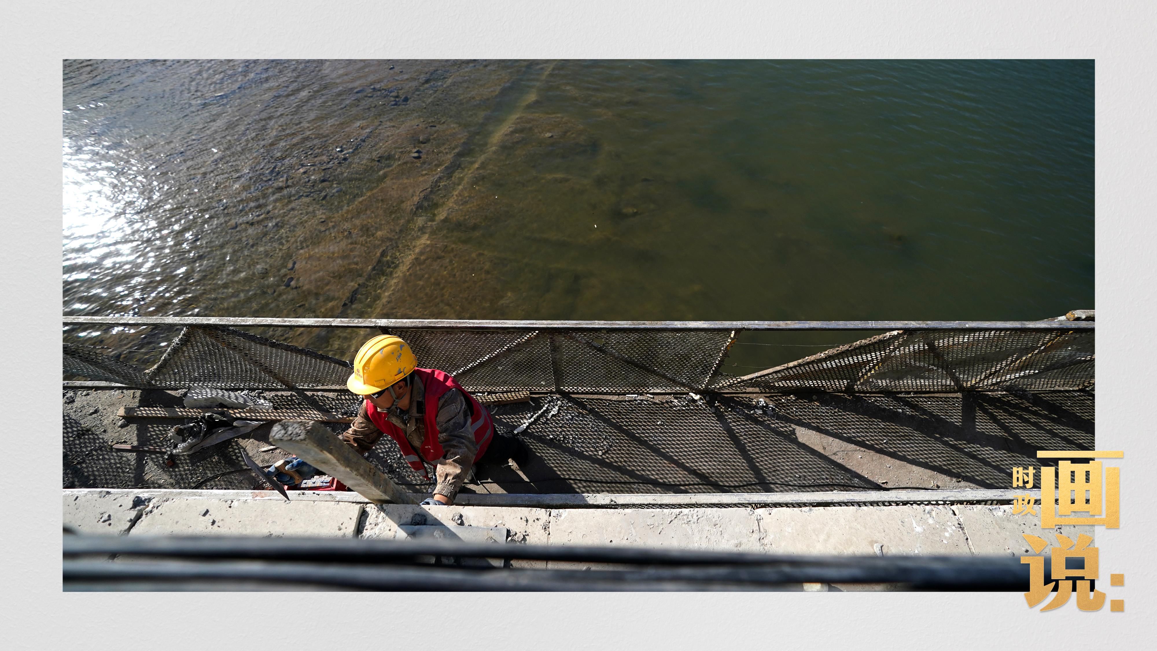 △工人在重新加固的桥梁上加装路灯。水峪嘴村,北京。冬日里的永定河静静流淌,一度受灾严重的流域沿线正在重回平静。
