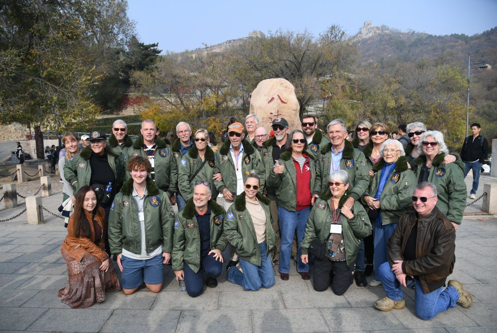 2023年10月29日,飞虎队老兵莫耶一行人在北京八达岭长城合影留念。当日,美中航空遗产基金会访华代表团成员陆续抵达北京。新华社记者 任超 摄