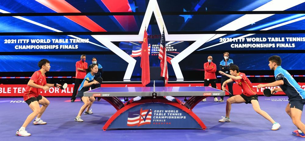 这是中美混双组合在2021年11月下旬举行的休斯敦世界乒乓球锦标赛期间合练。中美选手在休斯敦世乒赛上联合组队出战混合双打比赛,纪念中美“乒乓外交”50周年。新华社记者 吴晓凌 摄