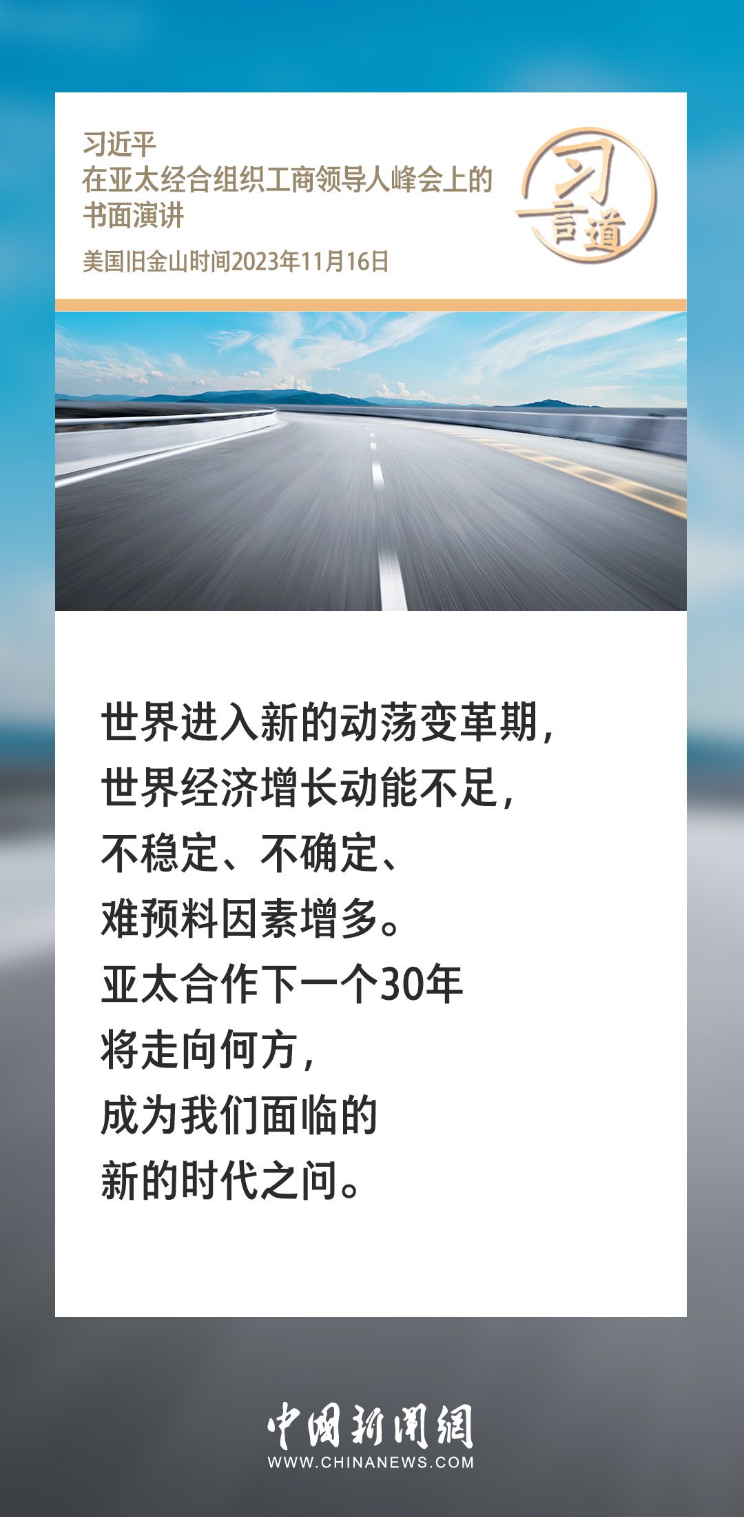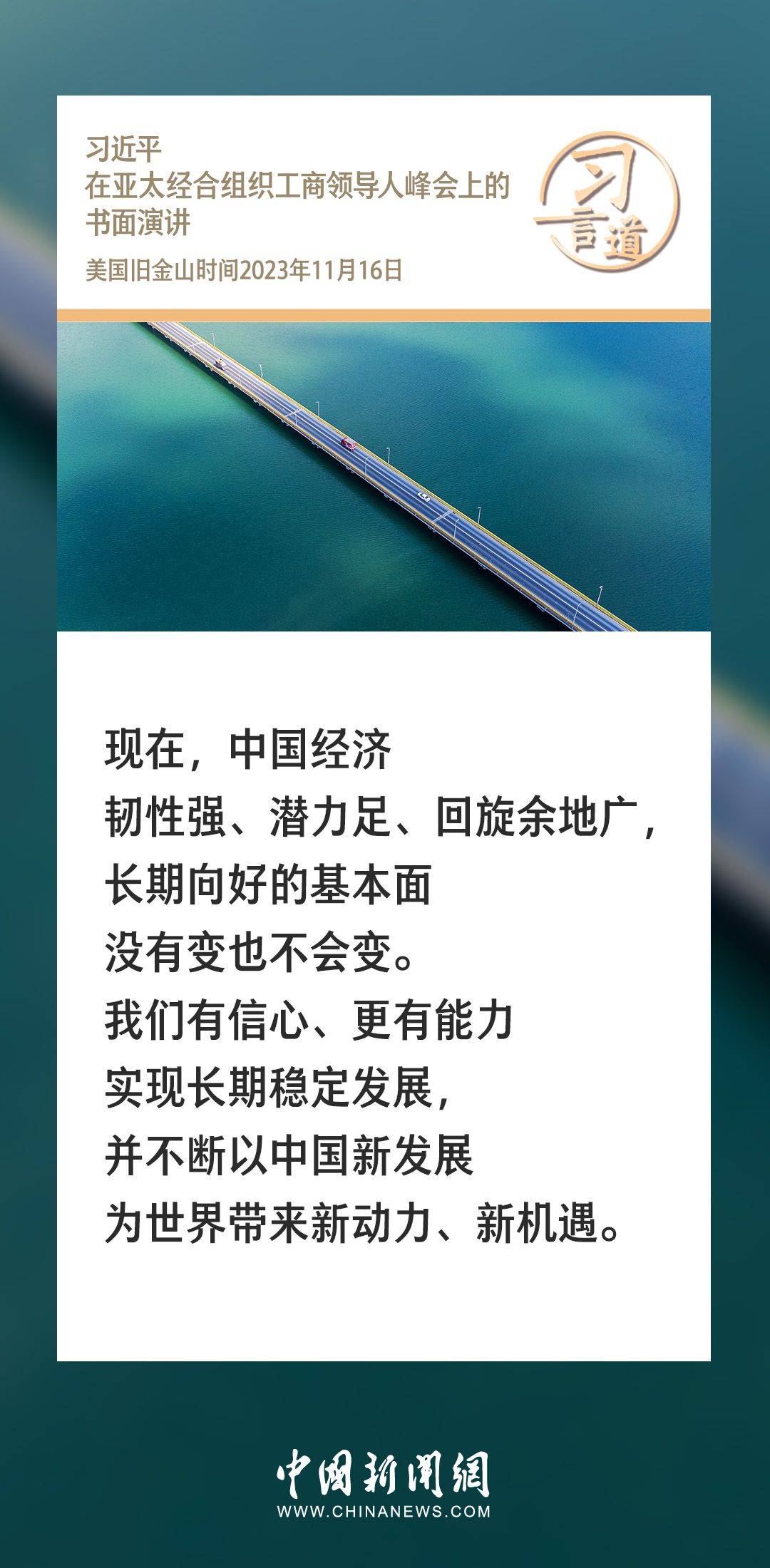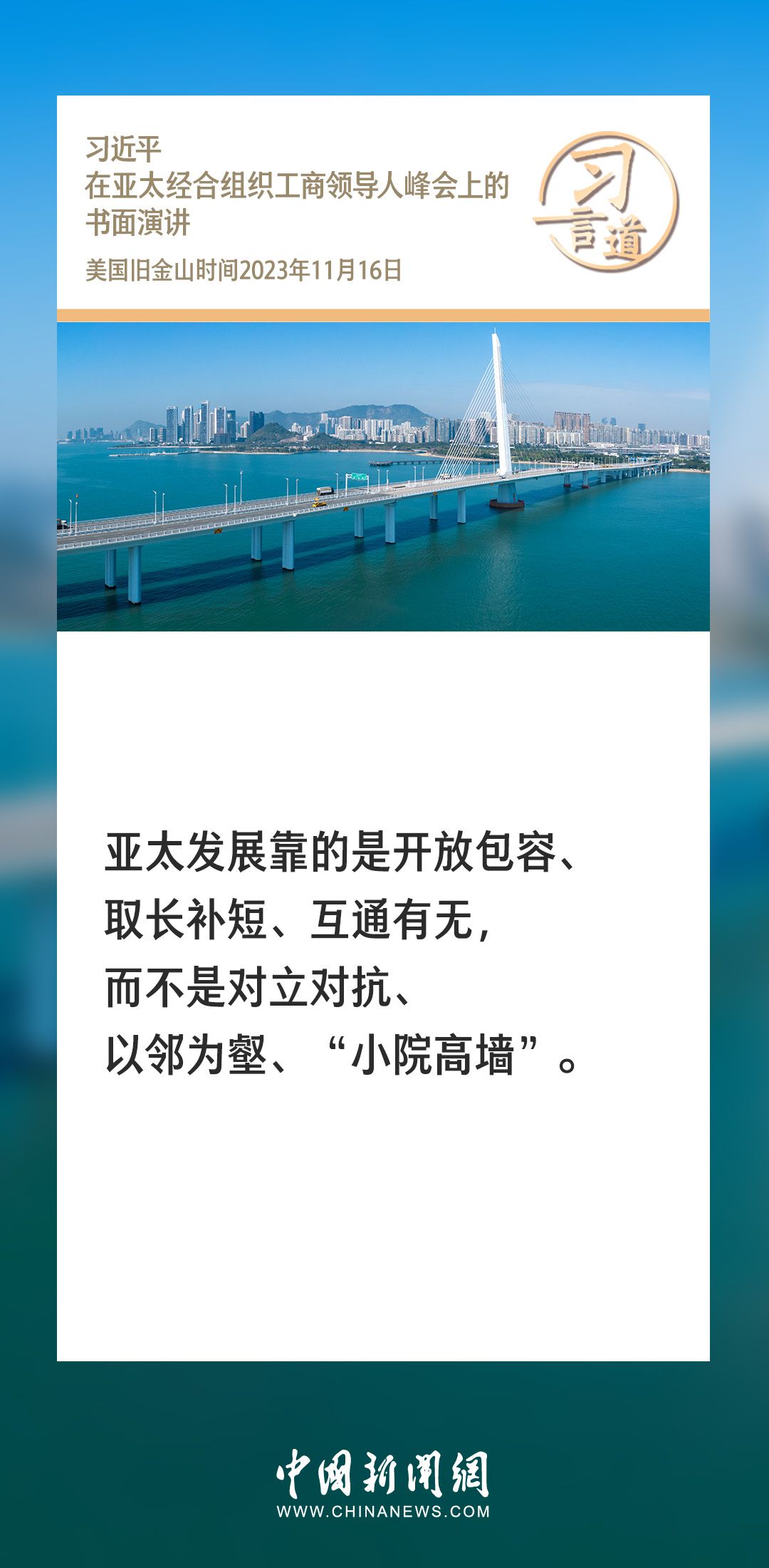 当地时间11月16日上午,国家主席习近平向在旧金山举行的亚太经合组织工商领导人峰会发表题为《同心协力 共迎挑战 谱写亚太合作新篇章》的书面演讲。习近平指出——