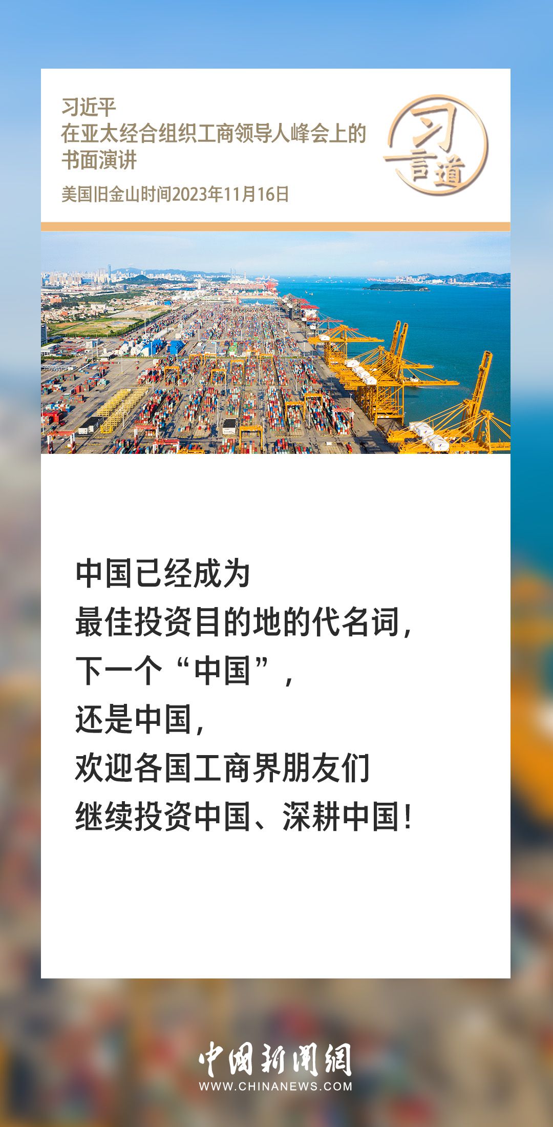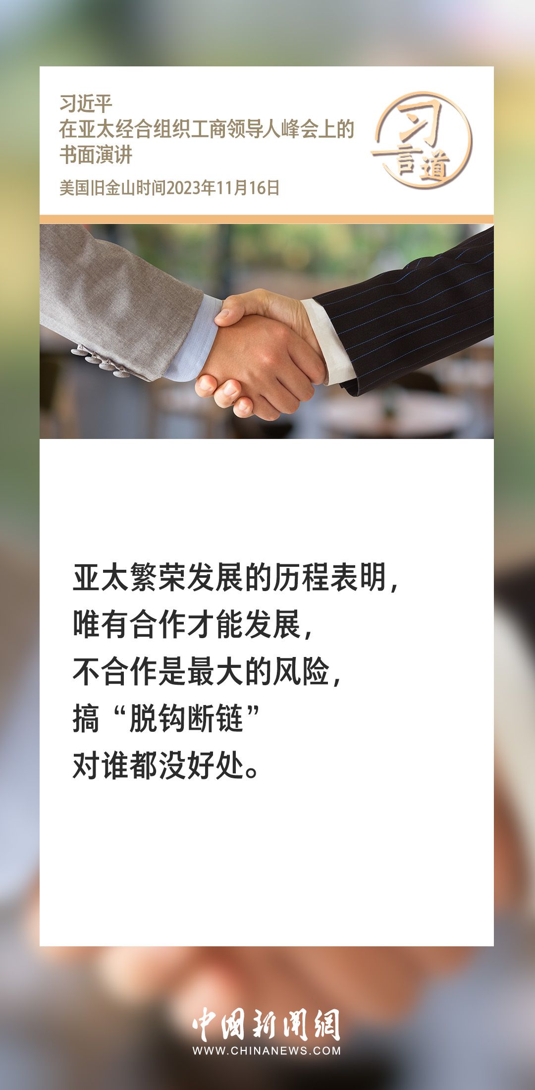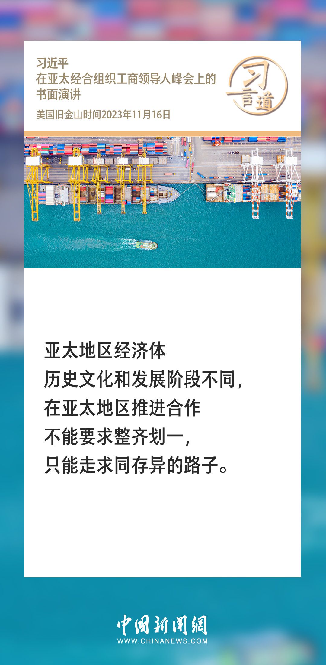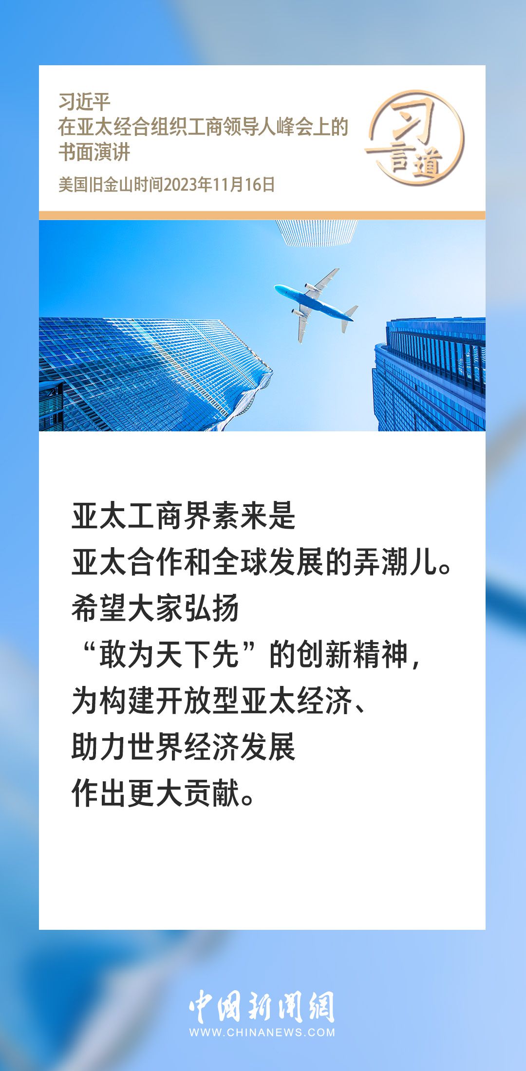 当地时间11月16日上午,国家主席习近平向在旧金山举行的亚太经合组织工商领导人峰会发表题为《同心协力 共迎挑战 谱写亚太合作新篇章》的书面演讲。习近平指出——