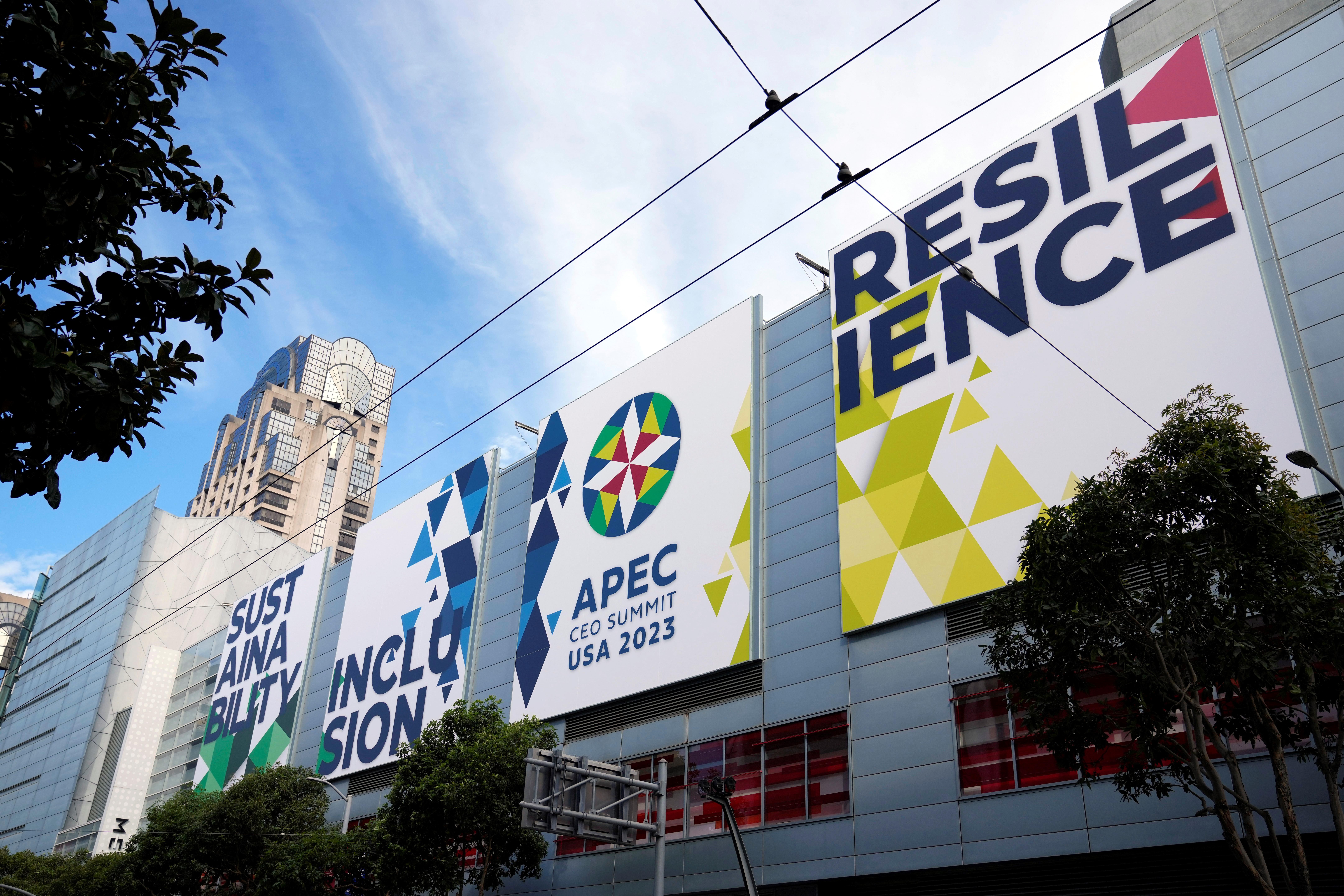 △近日,美国加利福尼亚州旧金山,街道悬挂亚太经济合作组织领导人非正式会议宣传海报。