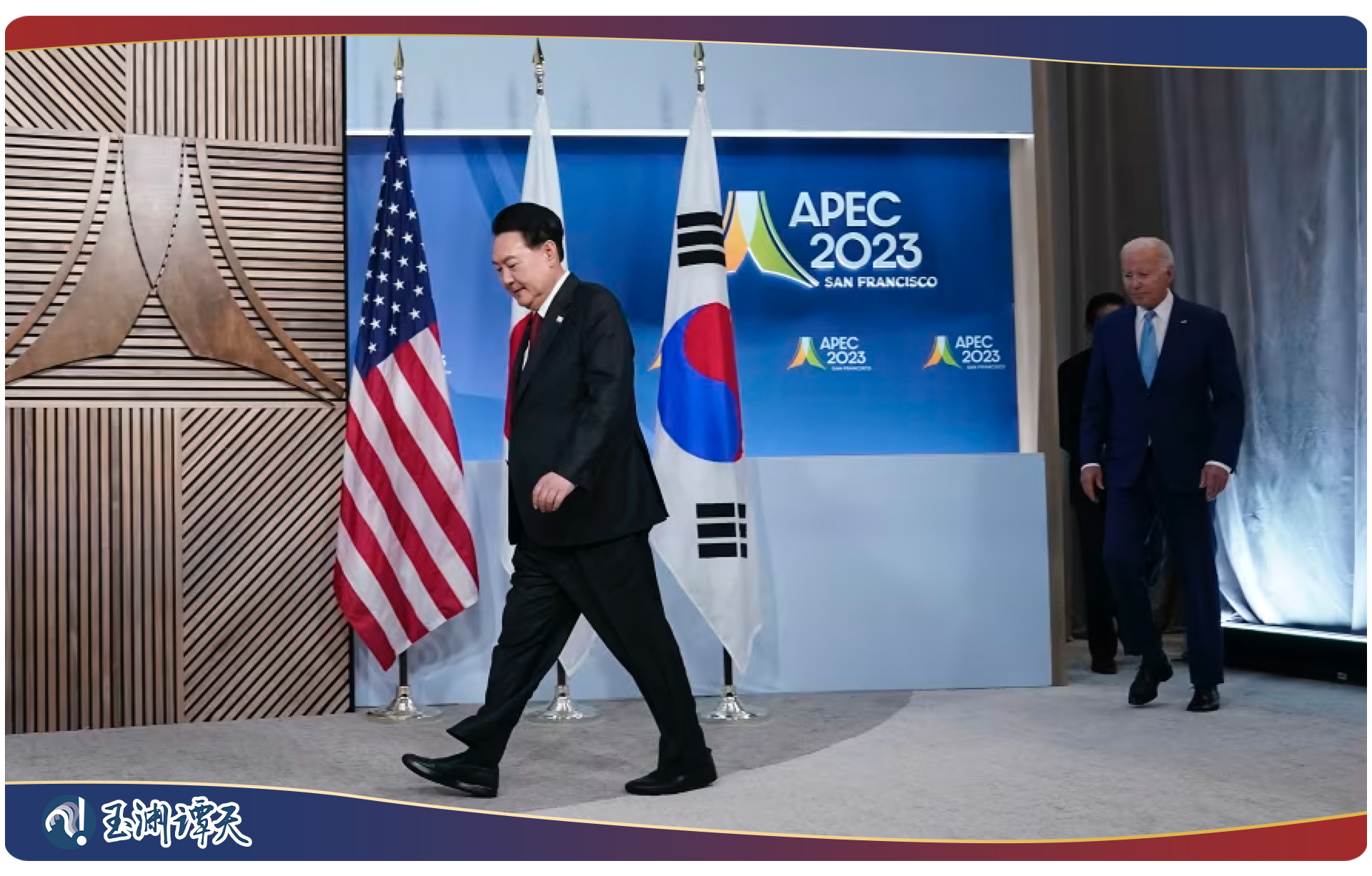 △日本首相岸田文雄、美国总统拜登以及韩国总统尹锡悦试图在APEC会议期间合影