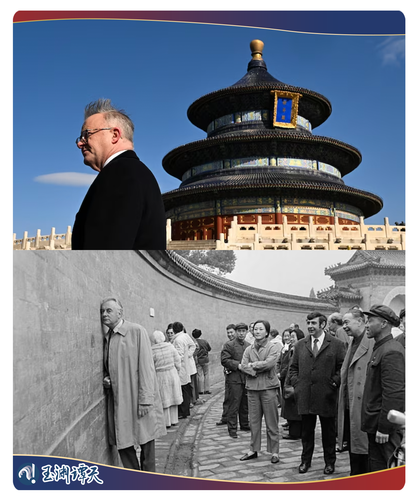△澳大利亚总理阿尔巴尼斯今年访华参观天坛,50年前惠特拉姆站在北京天坛的回音壁前