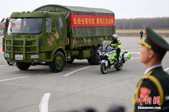 图为仪式结束后,志愿军烈士遗骸棺椁被护送前往沈阳抗美援朝烈士陵园。中新网记者 于海洋 摄