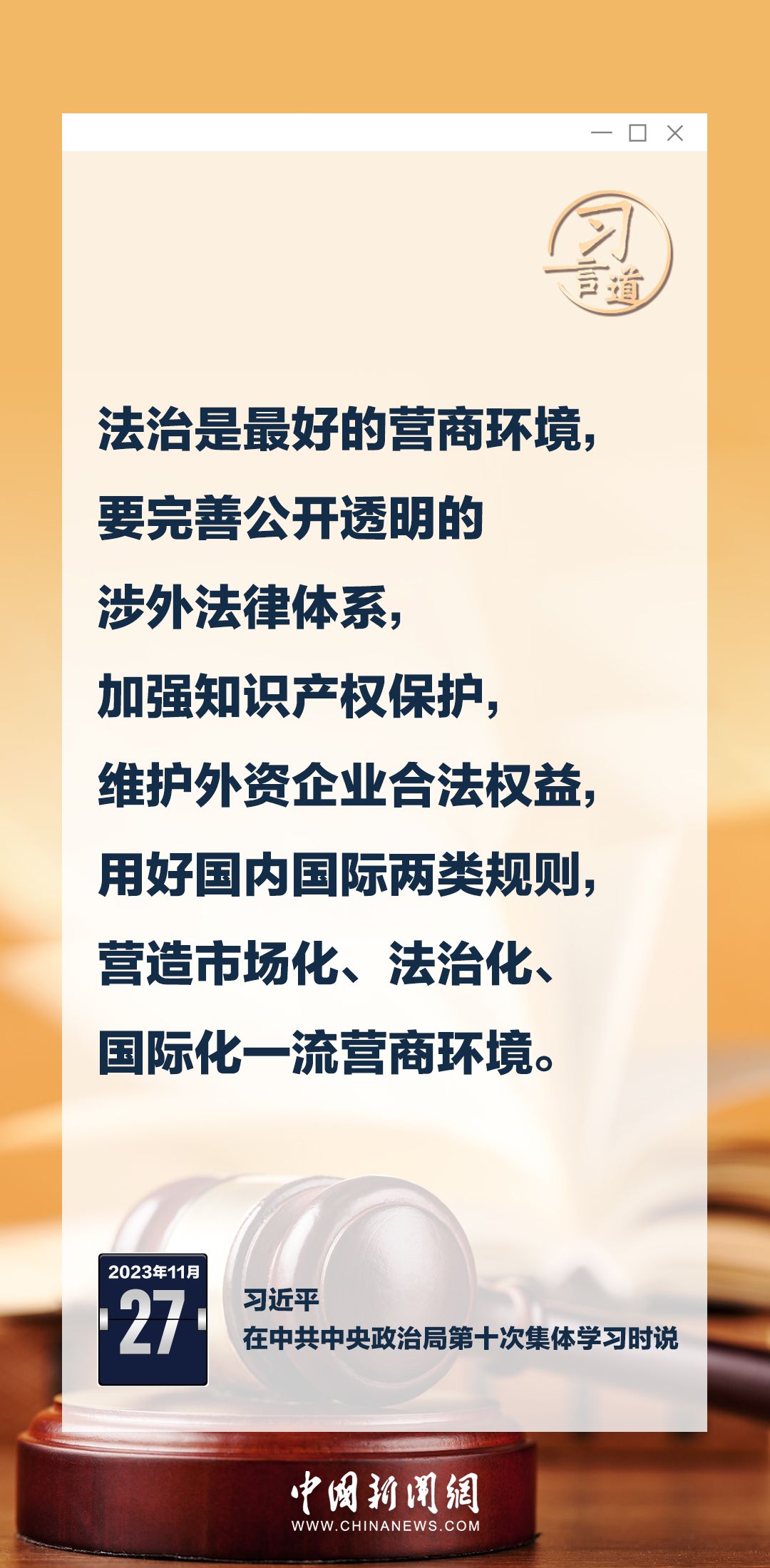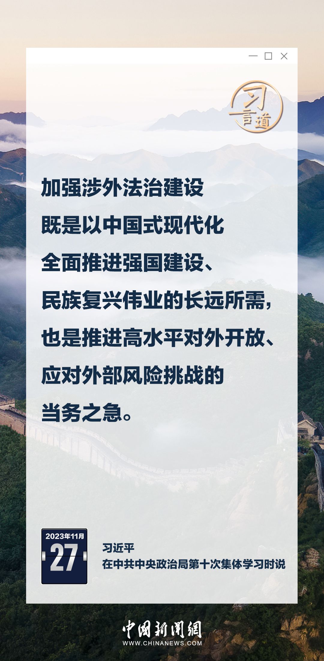 中共中央政治局11月27日下午就加强涉外法制建设进行第十次集体学习。中共中央总书记习近平在主持学习时强调——