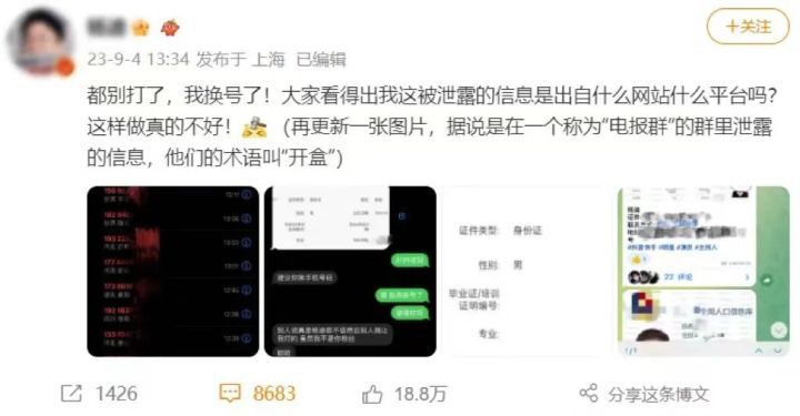某明星发文称被“开盒”了,个人信息泄露,很多人打来骚扰电话,不得已换了手机号 图源:“中国普法”微信公众号