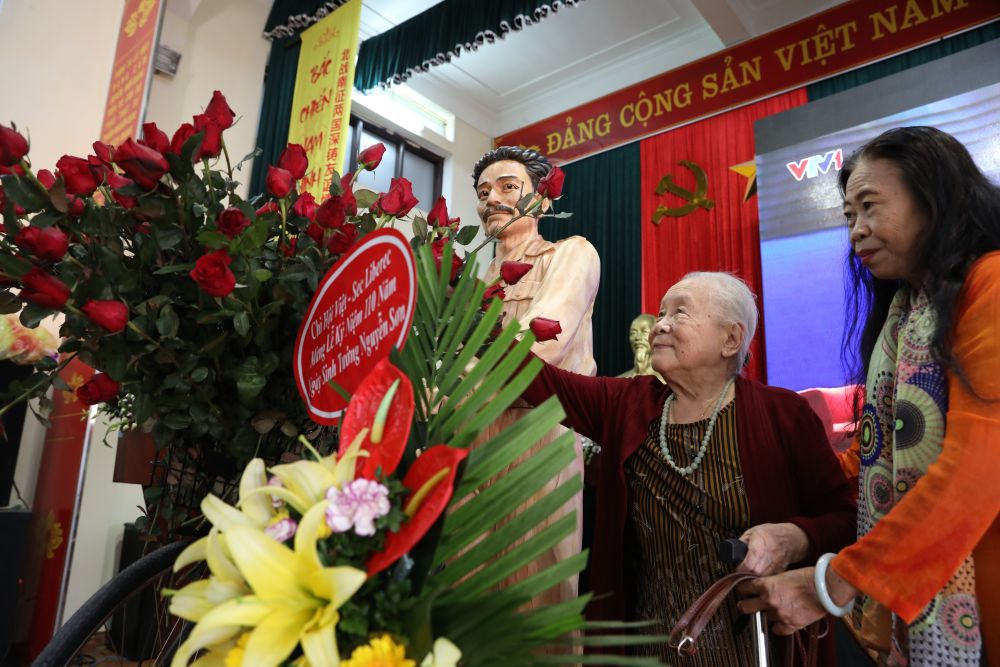 2018年9月30日,在越南河内市嘉林县骄骑乡,洪水将军亲属向其雕像献花。新华社记者王迪摄