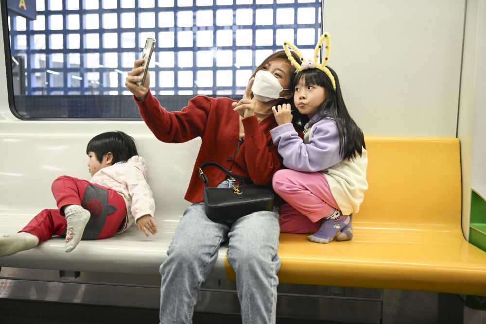 2023年12月9日,市民在越南河内吉灵-河东线轻轨车厢里自拍。新华社记者程一恒摄