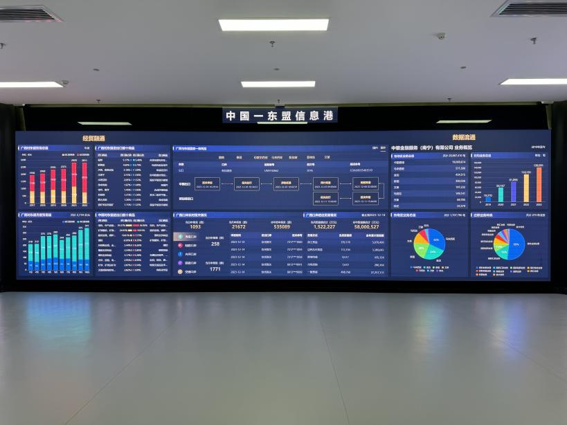 在中国—东盟信息港数字经济展示中心,3米高的电子显示屏上,边民互市贸易的数字在不断跳动。这个集交易、通关、金融和物流为一体的中国—东盟“商贸通”数字化平台,可以为客户提供跨境贸易全链条、数字化、一站式综合服务,实现边民互市当天交易、当天通关。