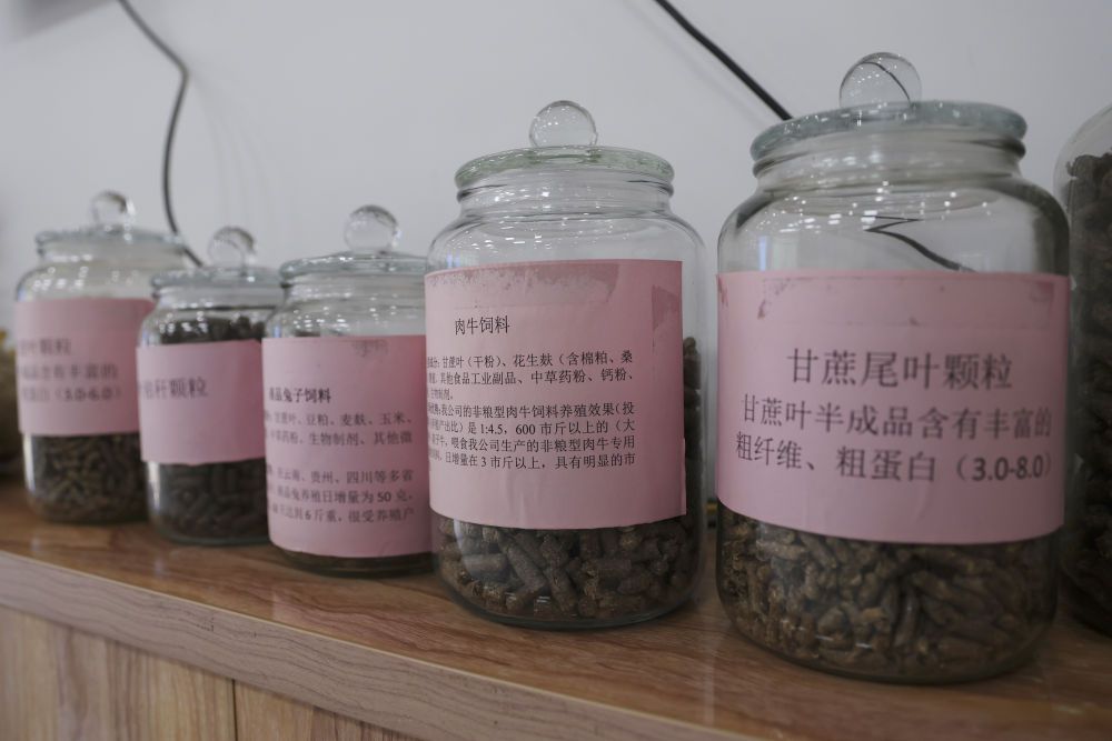 这是12月13日在来宾市兴宾区小平阳镇一家饲料厂拍摄的以甘蔗尾叶为原料制成的饲料。