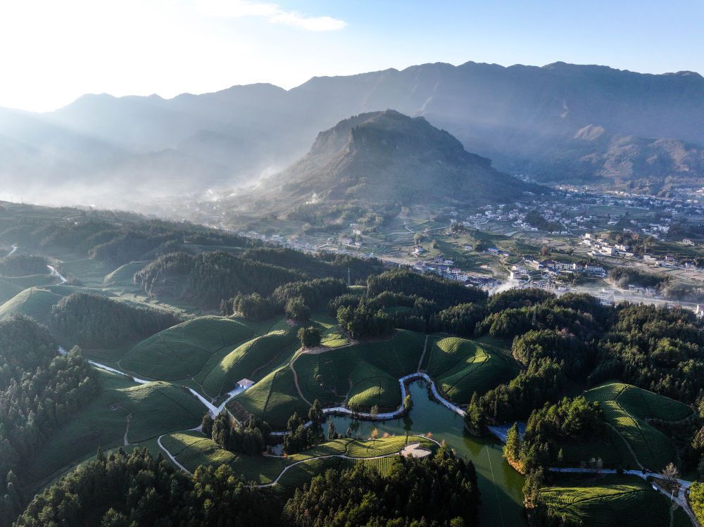 这是2023年12月5日拍摄的湖北省鹤峰县走马镇杨柳池茶园风光(无人机照片)。新华社记者 杨文斌 摄
