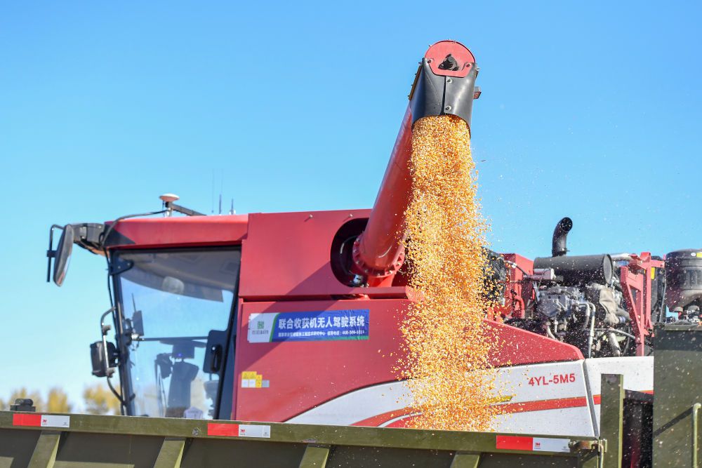 在中国科学院“黑土粮仓”科技会战长春示范区公主岭示范基地,无人驾驶农机将收获的玉米装车(2023年10月19日摄)。新华社记者 张楠 摄