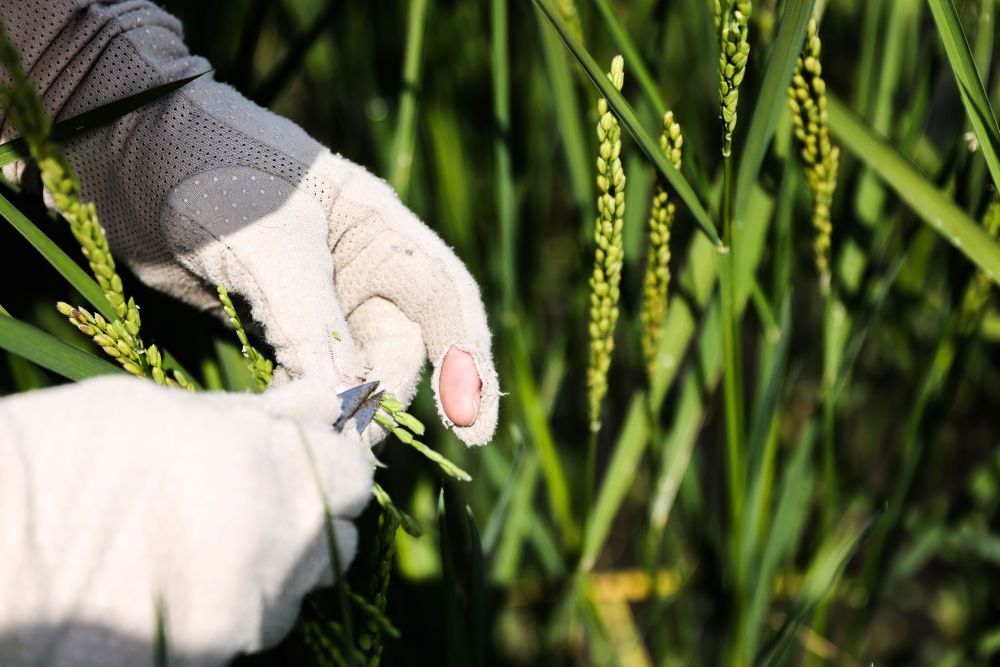 2023年2月22日,青岛海水稻研究发展中心的科研人员于萌在三亚的国家南繁科研育种基地里做水稻杂交实验。新华社记者 张丽芸 摄