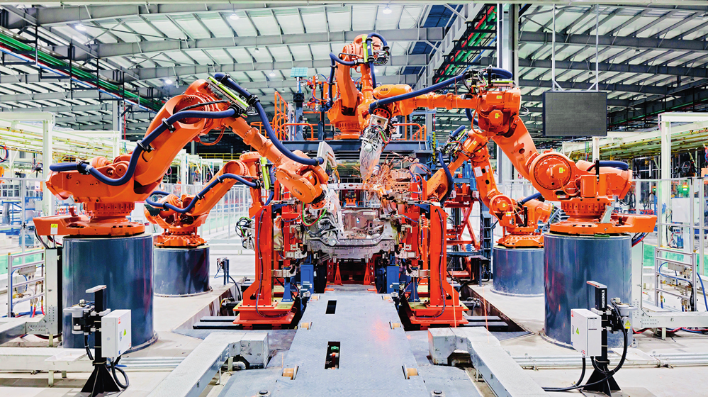 浙江清华长三角研究院新能源汽车研发中心的新能源汽车制造焊装线(2021年6月摄)。 浙江清华长三角研究院供图