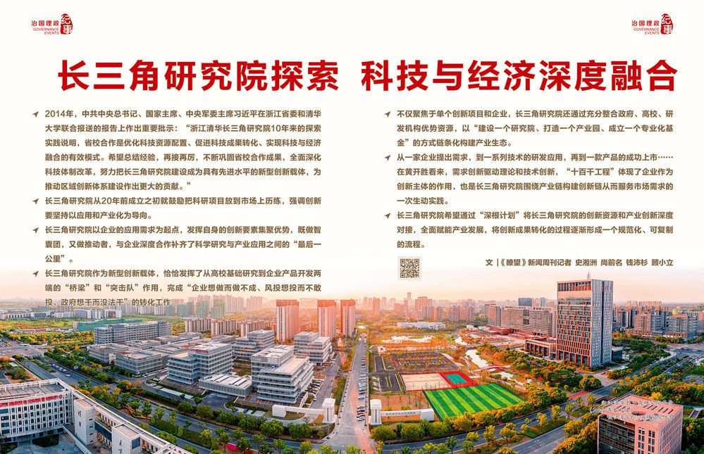 2003年底,在时任浙江省委书记习近平的亲自推动下,浙江清华长三角研究院(以下简称“长三角研究院”)正式成立,落地浙江嘉兴。作为浙江省人民政府与清华大学共建的新型创新载体,长三角研究院成立以来立足浙江、面向长三角,以自收自支、市场化运营探索走出一条省校合作的有效模式,逐步成长为长三角区域重要的产学研试验平台和成果转化基地。
