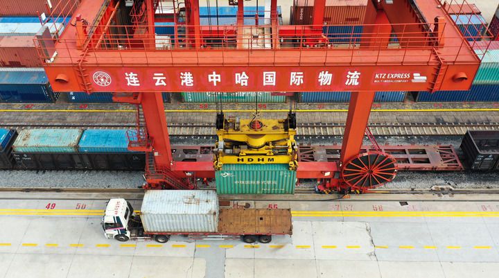 云台山下、黄海之滨,江苏自贸区连云港片区的中哈连云港物流合作基地,每天数以百计的集装箱从这里搭乘中欧班列,驶往中亚。