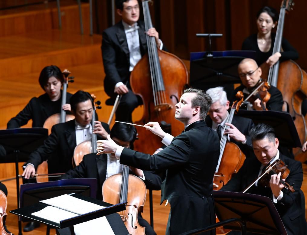 1月12日,在美国费城,中国演奏家陆轶文(中)在2024年费城交响乐团新春音乐会上演出。
