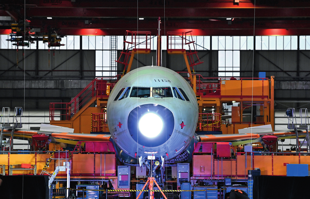 空客天津总装线的首架空客 A321 飞机上线总装(2022 年 11 月 9 日摄) 赵子硕摄/本刊