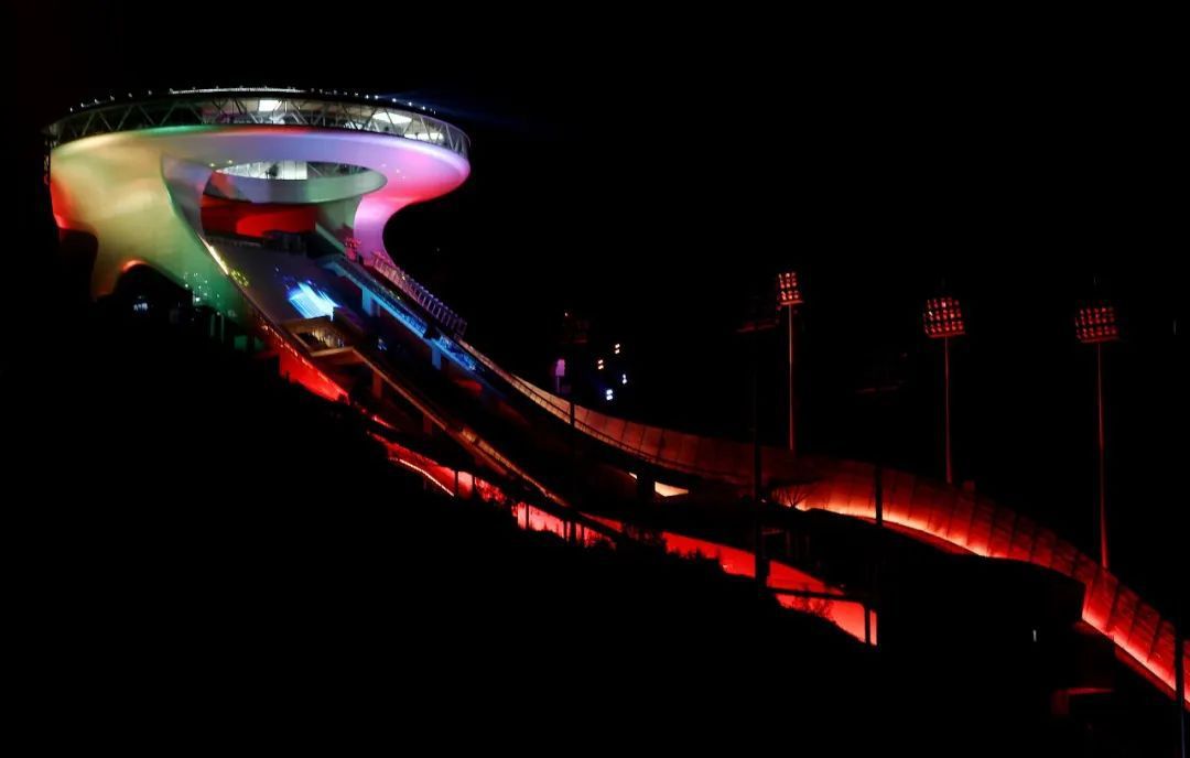 △国家跳台滑雪中心外形如中国古代象征吉祥的如意,又名“雪如意”。