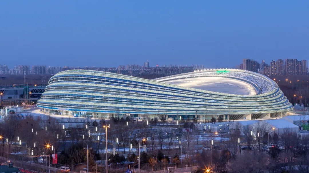 沿北京中轴线一路向北,空中俯瞰,国家速滑馆宛若冰刀在冰面上刻下的晶莹轨迹。它的另一个名称“冰丝带”,由此得名。