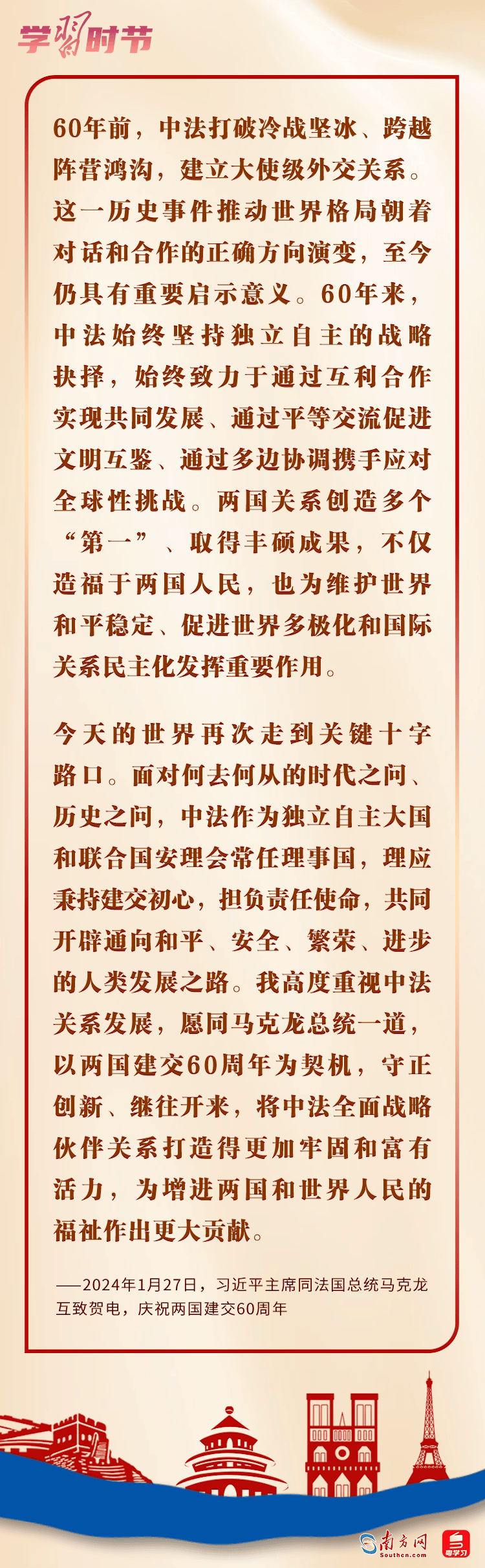 1月27日,国家主席习近平同法国总统马克龙互致贺电,庆祝两国建交60周年。习近平主席指出,60年前,中法打破冷战坚冰、跨越阵营鸿沟,建立大使级外交关系。两国关系创造多个“第一”、取得丰硕成果,不仅造福于两国人民,也为维护世界和平稳定、促进世界多极化和国际关系民主化发挥重要作用。
