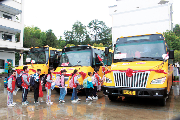 △2023年9月28日,湖北竹山县校园直通车全域开通后,学生在有序排队乘车。第二批主题教育开展后,竹山县将实施农村道路畅通工程作为为民办实事的重要内容。