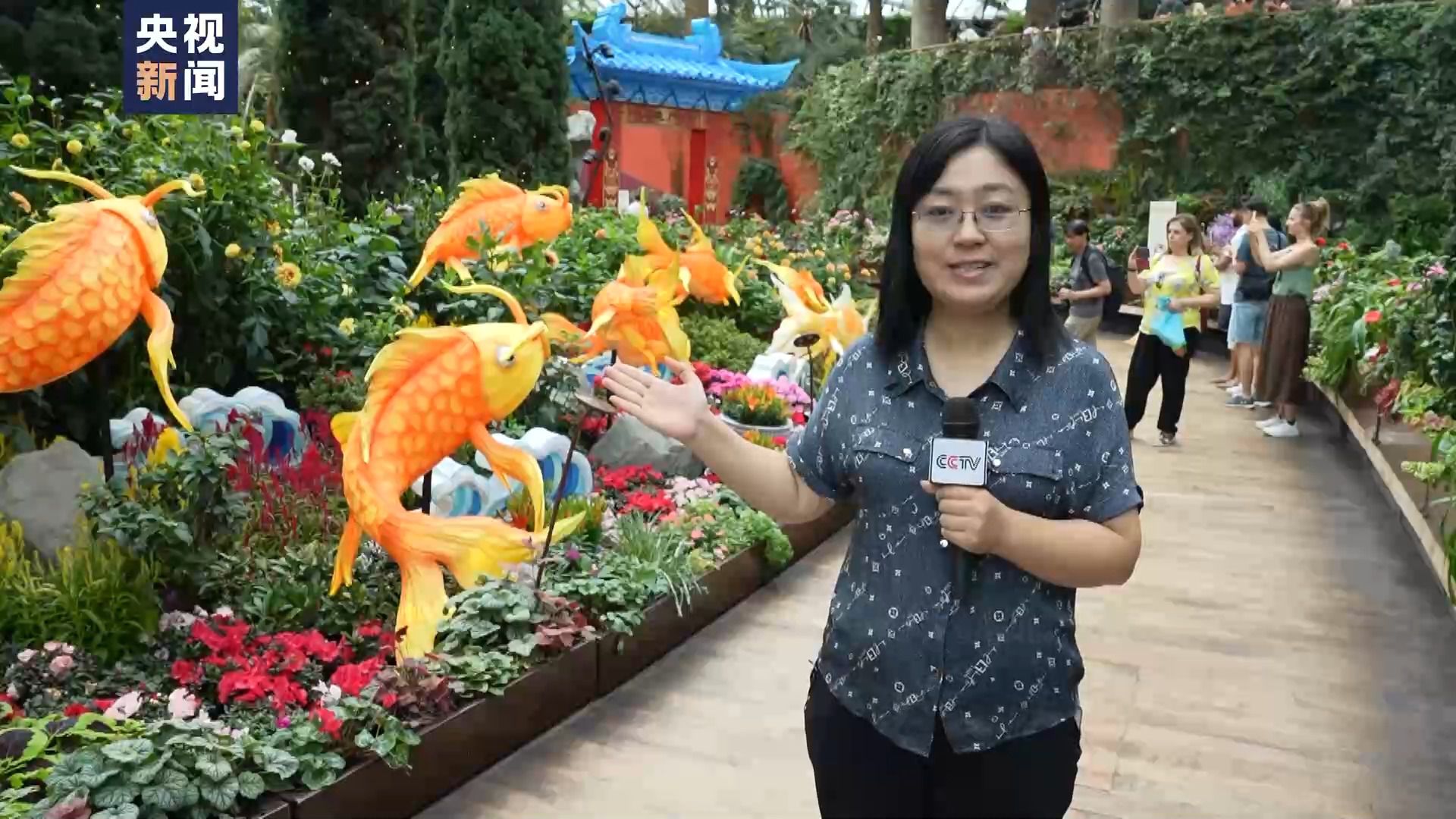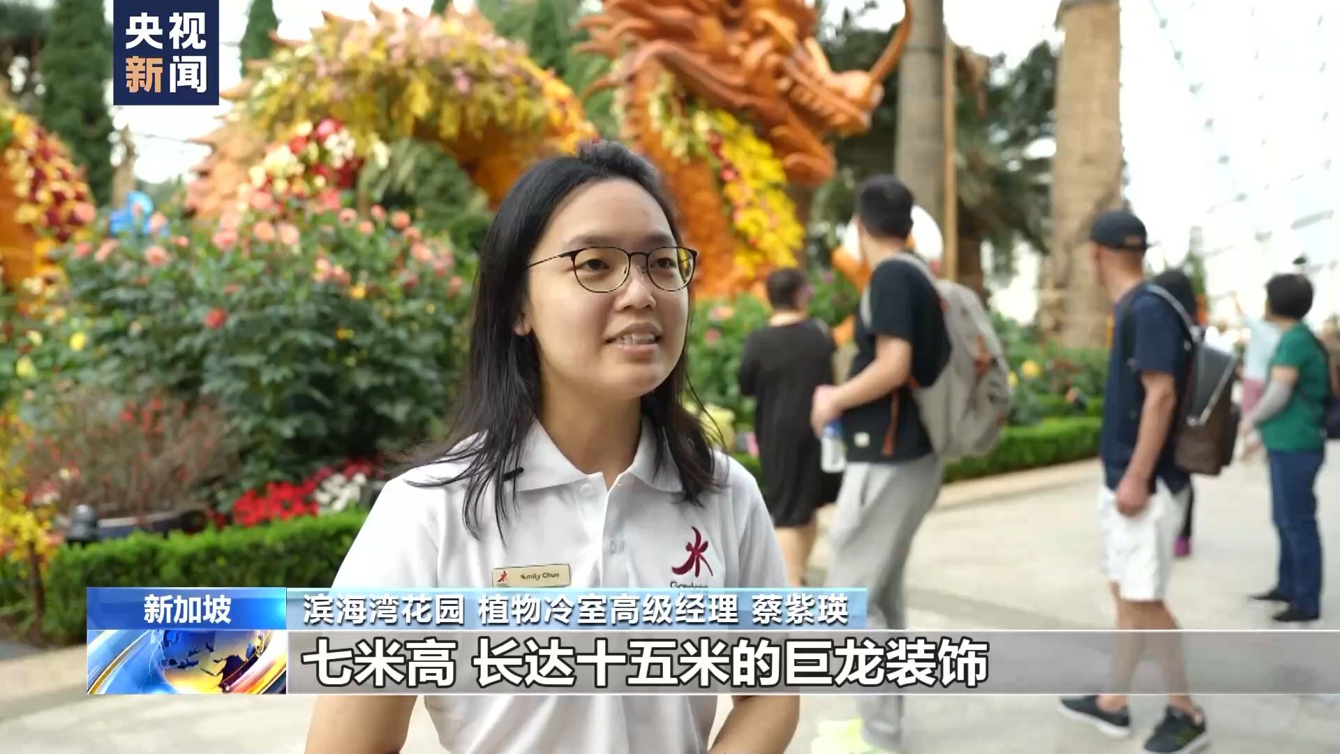 总台记者 刘畅:我身后的这组鲤鱼跳龙门的花灯,是新加坡滨海湾花园的花穹专门为龙年春节推出的特色花灯。此外还有8条形态各异的龙灯和龙形装置分布在花穹四处。春节临近,很多中国游客来到这里,体验这里浓浓的春节氛围。