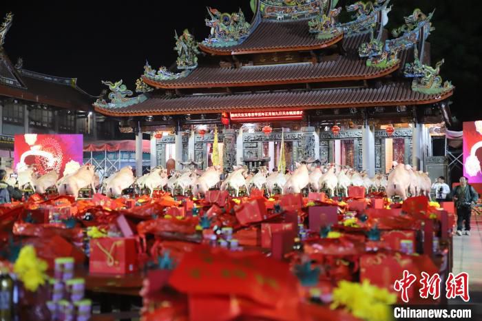 2月17日23时起,福建省漳州市芗城区天宝镇珠里村玉尊宫、台湾宜兰草湖玉尊宫同步举行“天公诞”祭拜仪式,天宝镇珠里村玉尊宫前各种贡品整齐摆放。 林妍萍 摄