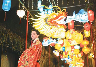 第38届中国·秦淮灯会近日在南京亮灯。图为一名外国游客在南京老门东景区赏灯留影。苏 阳摄(人民视觉)