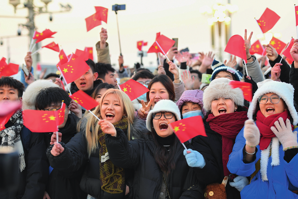 北京天安门广场举行隆重的升国旗仪式。图为观众在升旗仪式结束后欢呼(2024年1月1日摄)陈钟昊摄/本刊