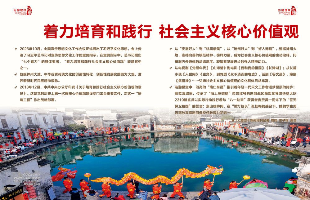 ◇2023年10月,全国宣传思想文化工作会议正式提出了习近平文化思想,会上传达了习近平总书记对宣传思想文化工作的重要指示。在重要指示中,总书记提出“七个着力”的具体要求,“着力培育和践行社会主义核心价值观”即是其中之一。